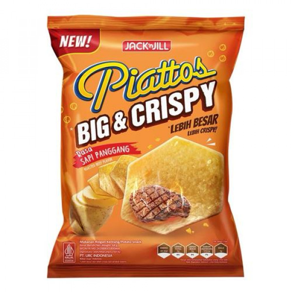 Piattos Snack Kentang Big Crispy Sapi Panggang 68 gadalah sebuah keripik kentang berbentuk unik. Terbuat dari kentang asli berkualitas, yang diolah secara higienis dan modern menggunakan teknologi tinggi. Kentang yang telah dicuci bersih dan dikupas di potong berbentuk segi 6 yang unik. Diiris tipis dan digoreng pada suhu yang tepat, sehingga menghasilkan keripik kentang berbentuk segi 6 dengan tekstur yang renyah. Dibalur dengan taburan perisa sapi panggang bubuk yang nikmat, memberikan rasa asin gurih yang nikmat pada keripik kentang. Dikemas dalam kemasan kantung ukuran 68 gram untuk menjaga rasa dan kualitas keripik. Cocok dijadikan cemilan saat sedang bersantai atau berkumpul bersama teman. Rasakan nikmatnya keripik kentang berbentuk unik pada Piattos Snack Kentang Sapi Panggang 68 g.